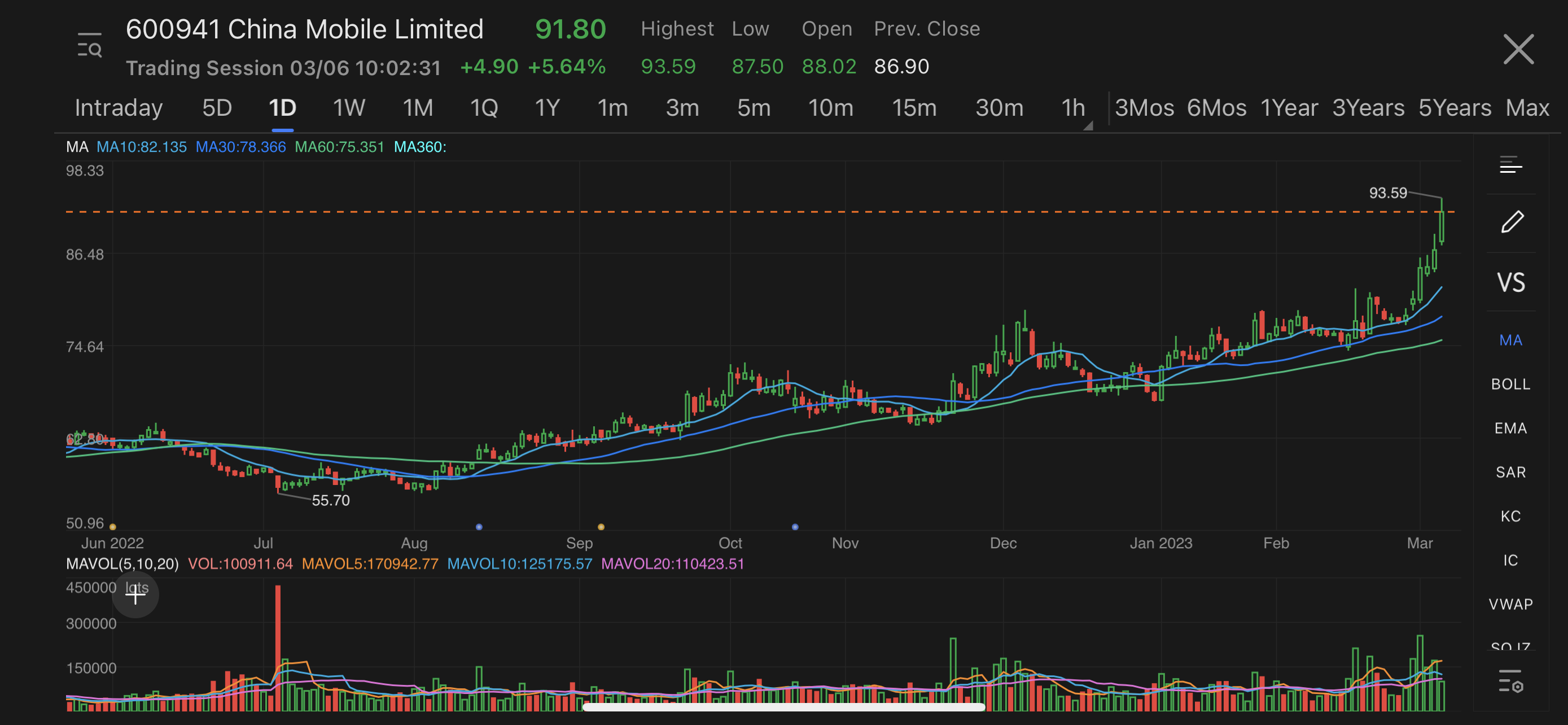 China’s telecom operators continue rallying on Monday, with China Mobile surging as much as 7.6% in Shanghai to hit a new record high of 93.59.