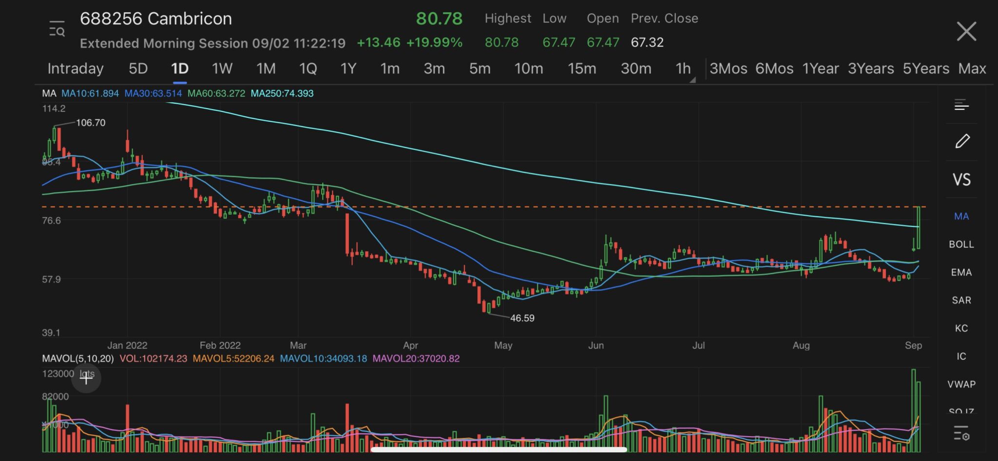 China’s top AI chip company Cambricon Technology, listed on the tech-focused Star Market on the Shanghai Stock Exchange, rally for the second straight trading day and surges by the daily limit of 20% to hit 80.78 yuan apiece at the close of the morning session on Friday, after the US imposed fresh restrictions of Nvidia’s top AI chip exports to China.