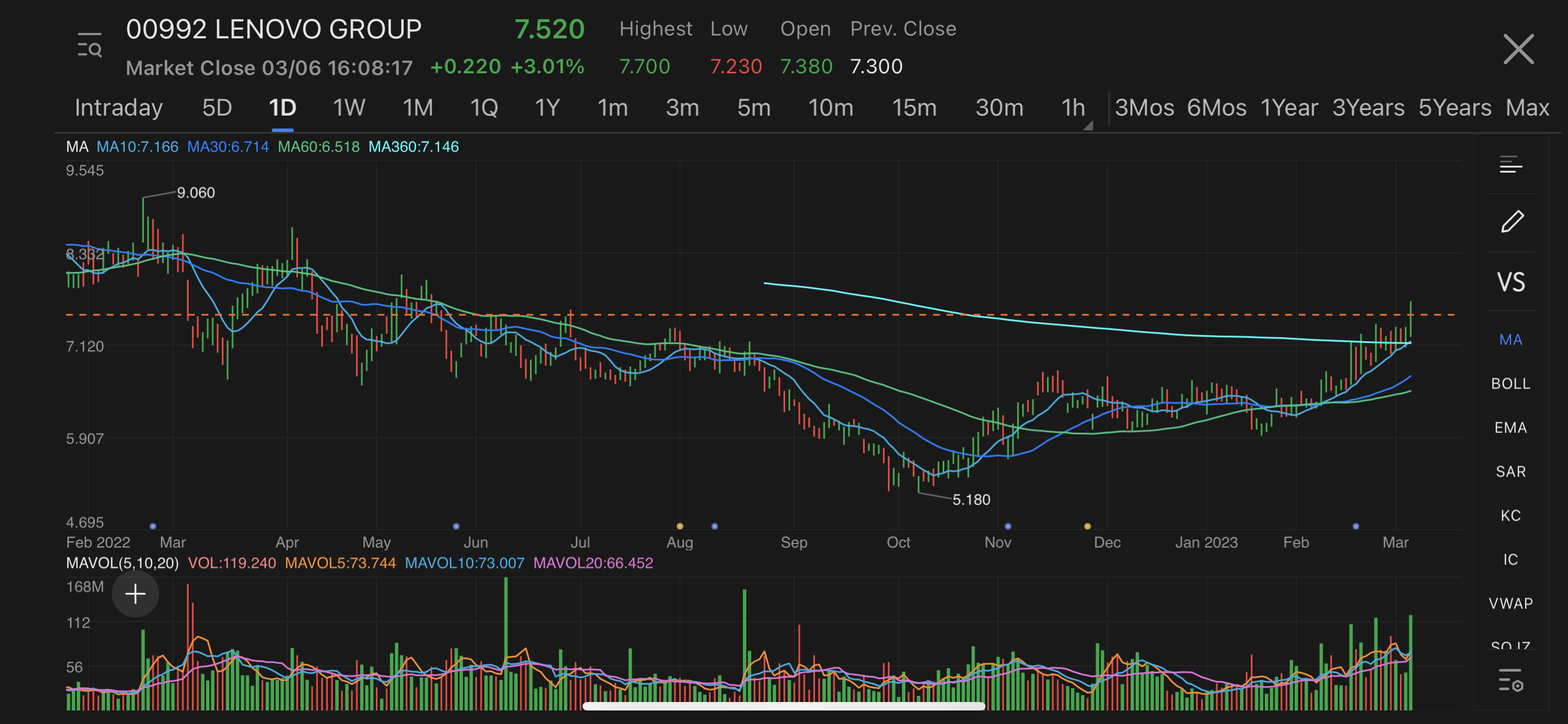 Shares of Lenovo Group continued to rise in Hong Kong, surging over 5% to hit HK$ 7.7 at one point, marking a new high since May 2022.