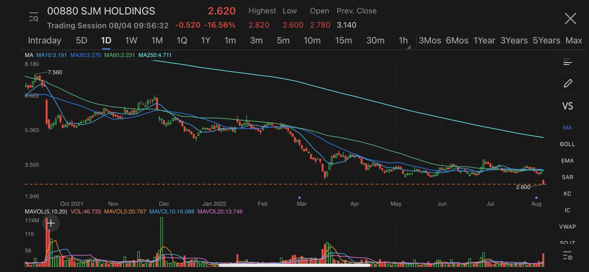 Macau casino operator SJM Holdings tumbles more than 16% in Hong Kong to hit HK$2.6, the lowest level since March 2010.